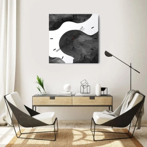 Az óra simán átmenetet mutató formákat ábrázol, amelyek az anyag kozmikus táncára emlékeztetnek. A fekete-fehér kompozíció elegáns, mégis erősen szimbolikus jelleget kölcsönöz az egésznek. A dizájnban használt absztrakció serkenti a képzeletet, teret engedve a saját értelmezésnek. Ez a modern művészet egy példája, amely nem kényszerít, hanem inspirál.