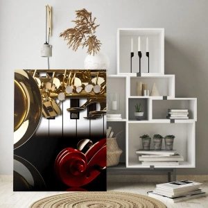 Üveg kép - Szaxofon, billentyűzet és vonó művészi kompozícióban - 70x50cm - Fémlemez, fa és elefántcsont - Modern fali dekoráció nappalihoz és hálószobához ARTTOR
