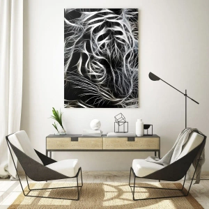 A tigris motívum, az erő és a bátorság szimbóluma, egyedi karaktert és energiát kölcsönöz a belső térnek. Az absztrakt forma modern dimenziót ad a festménynek, tökéletesen illeszkedik minimalista és ipari elrendezésekbe.