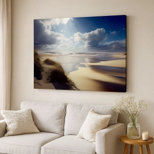 - A festmény egy vad, dűnékkel és kék éggel tarkított tengerpartot ábrázol, természeti szépséggel körülvéve. Ideális választás azok számára, akik értékelik a nyugalmat és a harmonikus tájat.