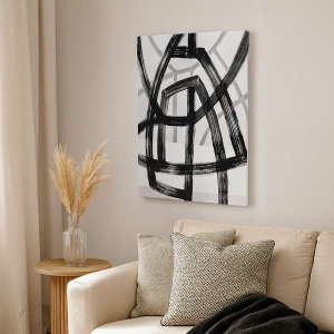 - Egy absztrakt festmény, amely világos háttér előtt metsző fekete-fehér vonalakat ábrázol. Minimalista és modern motívum, tökéletes belső terekbe, letisztultságot és harmóniát kölcsönöz a térnek. Tökéletes dekoráció a kortárs művészet szerelmeseinek.