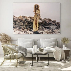 Üveg kép - Egy nő bohém stílusú ruhában, sziklás parton - 70x50cm - A kövek varázsa - Modern fali dekoráció nappalihoz és hálószobához ARTTOR