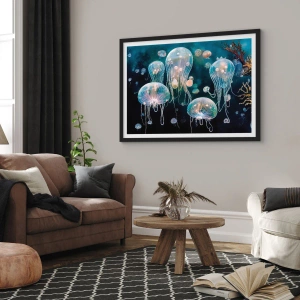 - Ez a poszter finom, világító medúzákat ábrázol, amelyek a tenger mélyén lebegnek. Átlátszó testük és finom fényük feltűnő vizuális hatást kelt.