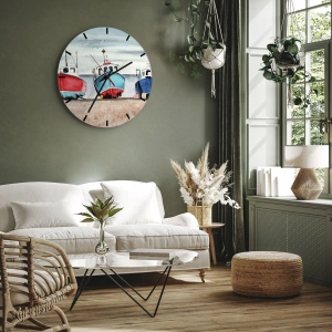- Ez az óra egy akvarell jelenetet ábrázol, melyen színes halászhajók horgonyoznak a parton. A könnyed, tengerészeti dizájn a kikapcsolódás és a tengeri kalandok hangulatát ragadja meg.