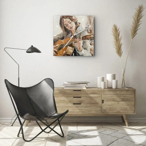 A zenei téma az üzenet finomságát és lírai jellegét hangsúlyozza. A gitárhangokba merülő nőalak a belső szenvedély és a művészi kifejezés szimbólumává válik. Ez a kompozíció ideális olyan terekbe, ahol a művészetnek, a kreativitásnak és az érzelmeknek helye van – nappalikba, zeneszobákba, kreatív stúdiókba és könyvtárakba.