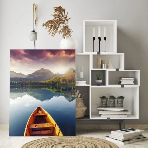 Üveg kép - Három fa csónak egy tavon, kilátással a hegyekre naplementekor - 70x50cm - Semmi a természet ellen - Modern fali dekoráció nappalihoz és hálószobához ARTTOR