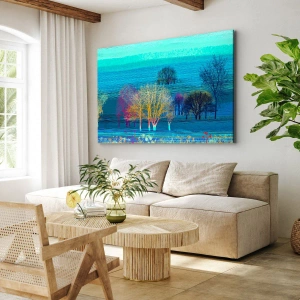Vászonkép "Ecsetelt tájkép" egy egyedi kompozíció, amely a természet szépségét minimalista stílussal ötvözi. Színes fákat ábrázol kék tájkép előtt, harmonikus és békés hangulatot teremtve.