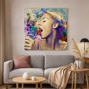 - festmény egy mikrofonba éneklő nő művészi portréját ábrázolja, színes effektekkel körülvéve. Tökéletes energiával és kreativitással teli enteriőrökbe.