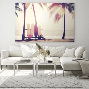 Nagyszerű nap lesz a trópusi tengerparton megörökített tökéletes pillanatot ragadja meg. Az előtérben pálmafák árnyékában elhelyezkedő szörfdeszkák csoportját látjuk, amelyeket a reggeli nap intenzív, aranyló fénye átsüt. Békés kép, ugyanakkor egy izgalmas, szörfözési kihívásokkal teli napot hirdet. A tenger és az ég előtti tér a szabadság és a természettel való harmónia érzetét kelti. A víz visszaveri a fényt, a napsütötte homok pedig pihenésre ösztönöz.