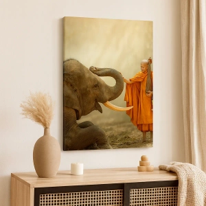 Vászonkép - Egy szerzetes és egy elefánt harmóniában a természet hátterében - 70x50cm - Találkozás az utazáskor - Modern fali dekoráció nappalihoz és hálószobához ARTTOR