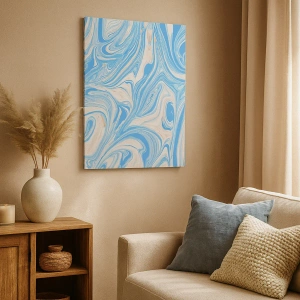 - Egy absztrakt festmény, melyen kék és fehér örvények láthatók márványszerű stílusban. Ez a modern és elegáns motívum tökéletes minimalista enteriőrökbe.