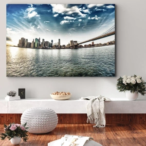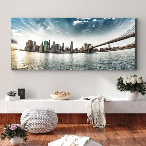 - festmény egy híddal körülvett városképet ábrázol, amelyet kék ég és finom felhők kereteznek. Az építészet dinamikus vonalai és a víz nyugalma harmonikus egészet alkot, amely ideális modern belsőépítészeti megoldásként.