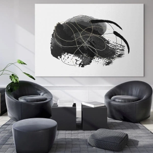 - Modern üvegfestmény fekete foltok és arany díszítések absztrakt kompozíciójával. Minimalista stílusa, eleganciája és kontrasztja ideális választássá teszi modern enteriőrökbe.