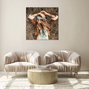 - Egy mosolygós nő bohém stílusban fekszik a szénában, a nyár színei és a természet szabadsága veszi körül. Ez a melegséggel és szabadsággal teli kép gondtalan hangulatot és pozitív energiát visz bármilyen enteriőrbe.
