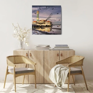 Falióra, Óra - Egy elegáns épület a vízparton, tükröződéssel a nyugodt felszínen - 30x30cm - A természet temploma - Modern fali dekoráció nappalihoz, konyhához és hálószobához ARTTOR