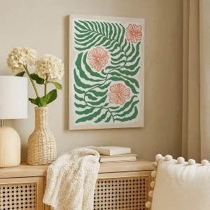 - Egy minimalista festmény, amely zöld leveleket és narancssárga árnyalatú virágokat ábrázol. Tökéletes modern enteriőrökbe, harmóniát és finomságot hoz.