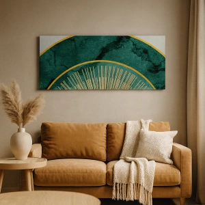 - Egy vászonkép absztrakt mintával, smaragdzöld és arany körökkel, amely tökéletes modern enteriőrökbe, amelyek elegáns kiegészítőket igényelnek.