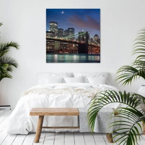 Vászonkép - New York City híd éjszaka kivilágított épületekkel - 70x50cm - Ragyogó éjszaka - Modern fali dekoráció nappalihoz és hálószobához ARTTOR
