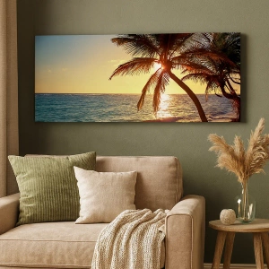 - Ez a 70x50 cm-es vászonkép egy festői trópusi naplementét ábrázol egy pálmafákkal szegélyezett tengerparton. Tökéletes dekoráció az egzotikus tájak és a nyaralás hangulatának szerelmeseinek.