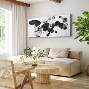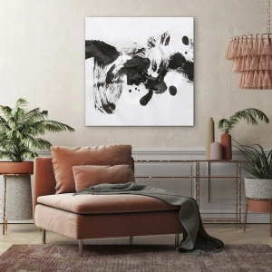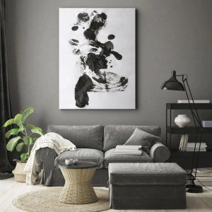 - A festmény fekete foltok absztrakt kompozícióját ábrázolja fehér alapon, feltűnő kontrasztot és egyensúlyt teremtve a káosz és a harmónia között. Tökéletesen kiegészíti a modern tereket, dinamikus és művészi hatást kölcsönözve nekik.