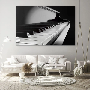 A festmény egy klasszikus zongorabillentyűzetet ábrázol, amely a művészetet, a nyugalmat és a kifejezést szimbolizálja. A hangszer fényes felületén a fényjáték hangsúlyozza a formáját és tágasság érzetét kelti. Ez a motívum tökéletesen illik a modern, minimalista belső terekbe, művészi jelleget kölcsönözve azoknak.
