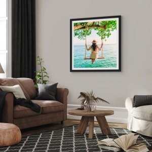 Poszter fehér keretben - Nő egy hintán a tengerparton, trópusi környezetben - 50x70cm - Az élet gyönyörű - Modern fali dekoráció nappalihoz és hálószobához ARTTOR