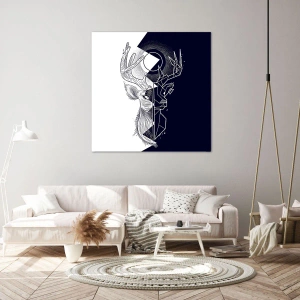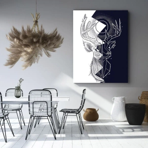 Az „Ellentékek küzdelme és egysége” című festmény egy egyedi alkotás, amely a „geometria” és a „természet” elemeit ötvözi egy harmonikus, mégis kontrasztos kompozícióban. Az egyik oldalon a „fekete” árnyalatú geometrikus minták dominálnak, míg a másik oldalon természetes formák, például szarvasagancsok tükröződnek, „fehérben” bemutatva. Az ellentétek ezen szokatlan harmóniája mélyen szimbolikus kifejezést kölcsönöz a festménynek, amely ideális a modern terekbe.