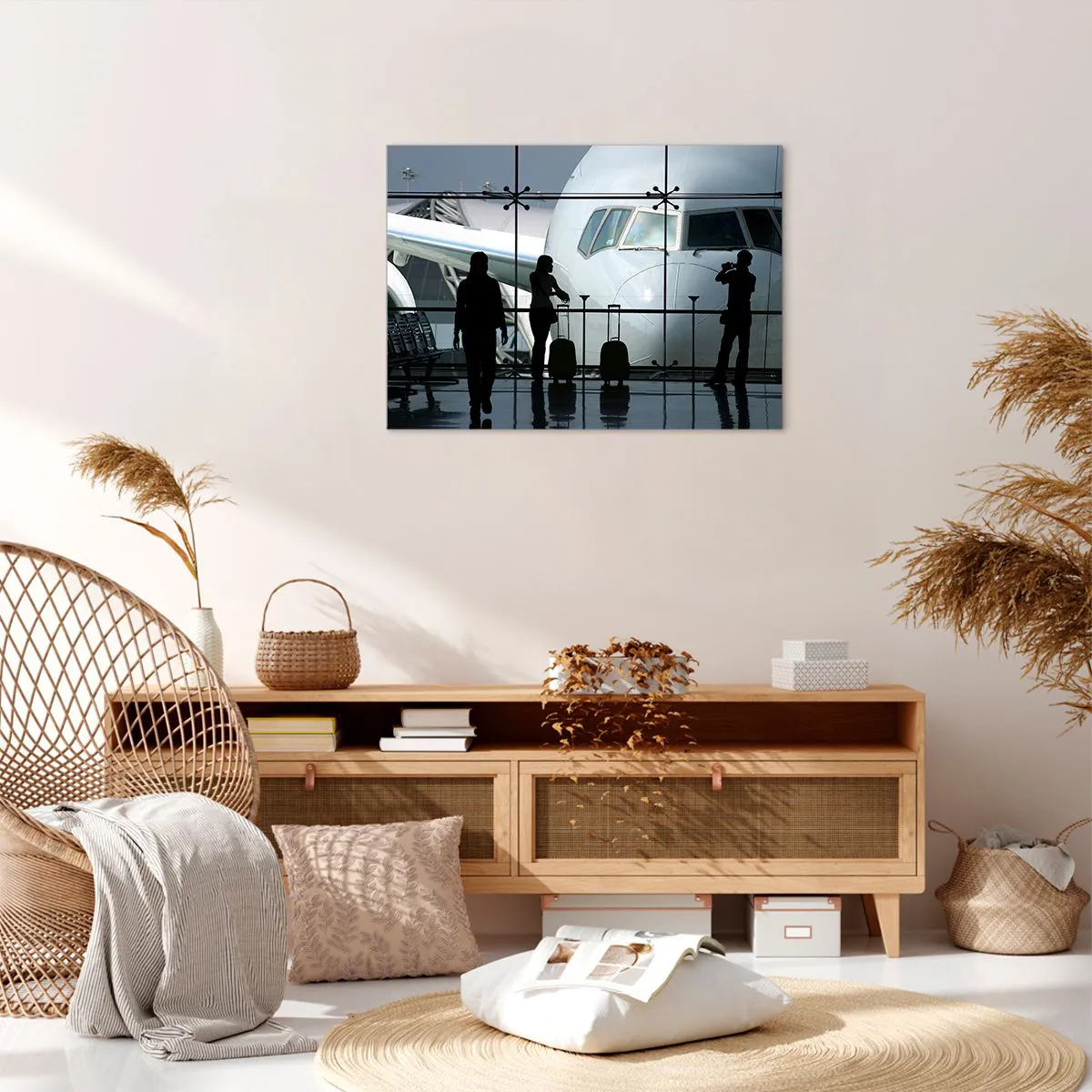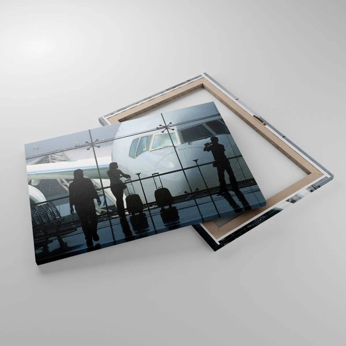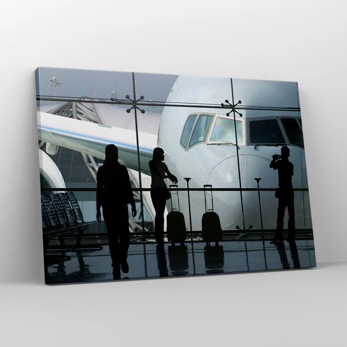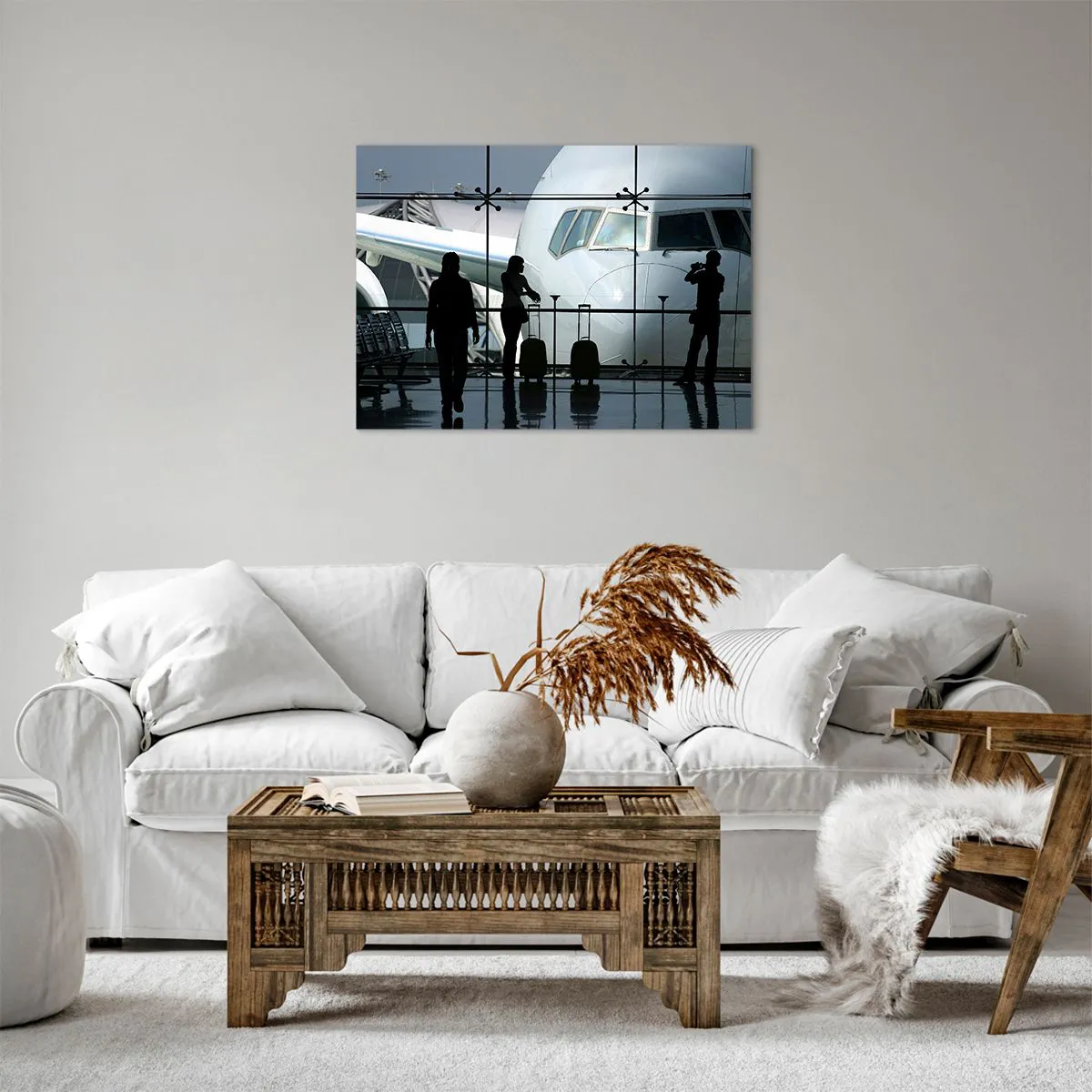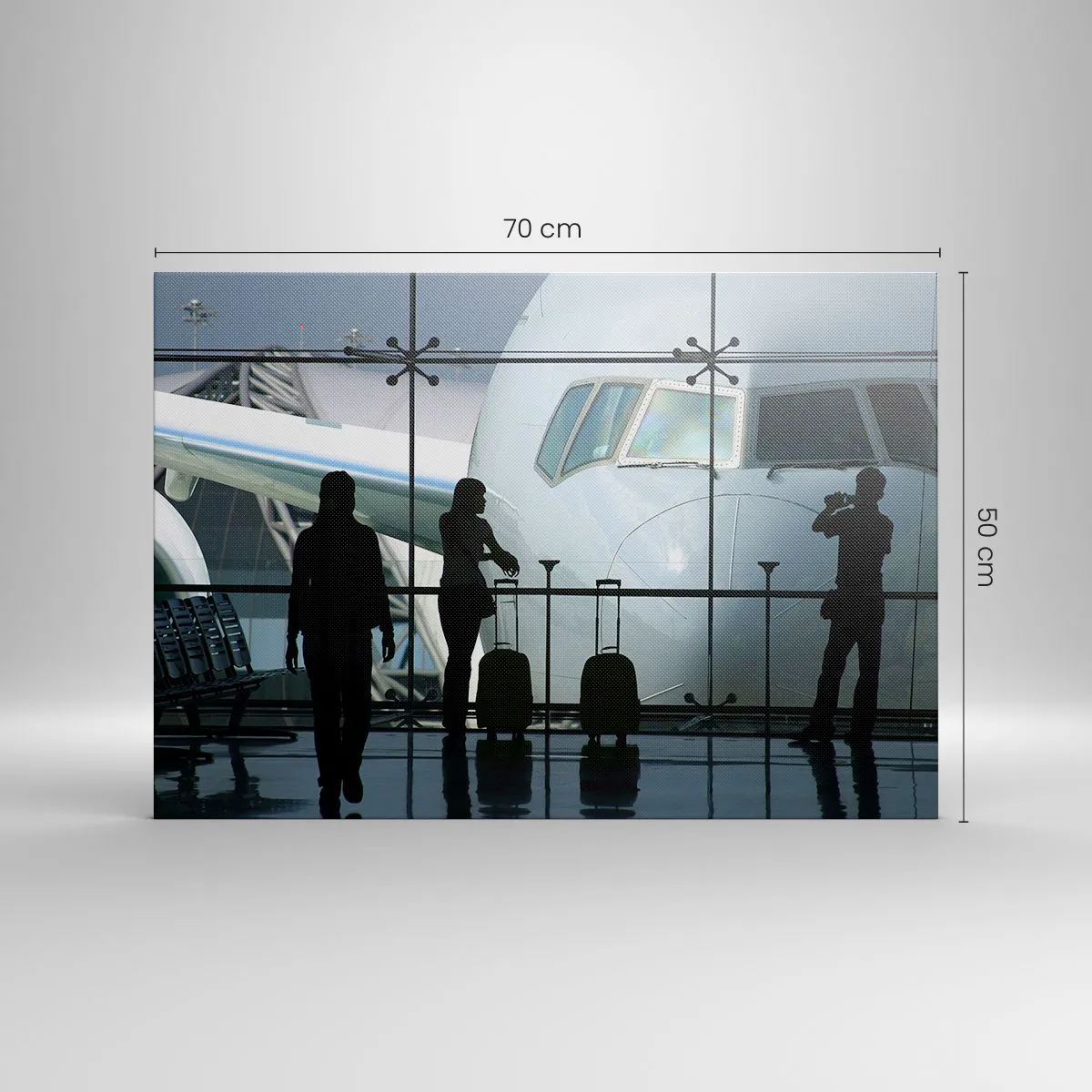 Vászonkép - Repülőtér emberek sziluettjeivel és a repülőgép látképével - 70x50cm - Vis a vis a repülőtéren - Modern fali dekoráció nappalihoz és hálószobához ARTTOR