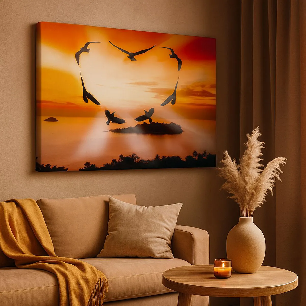 - A festmény repülő madarakat ábrázol, amelyek szív alakot alkotnak a lenyugvó nap hátterében. A bájos szigetkép és a meleg színek harmonikus és romantikus hangulatot teremtenek.