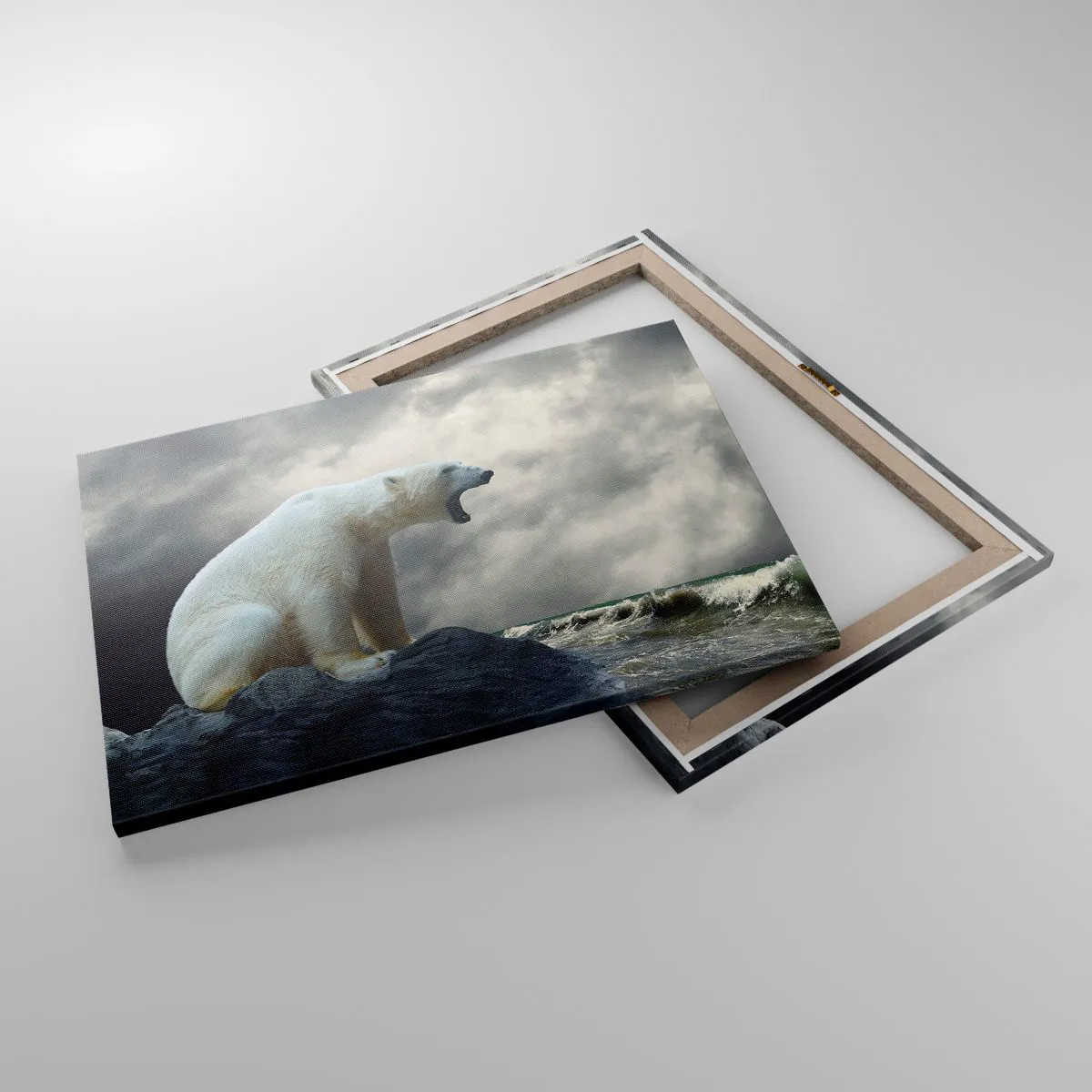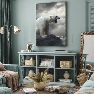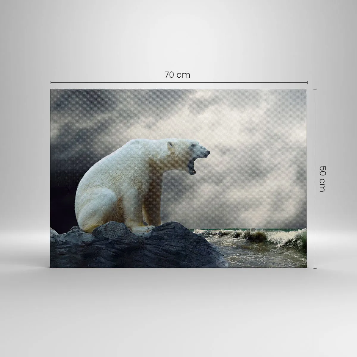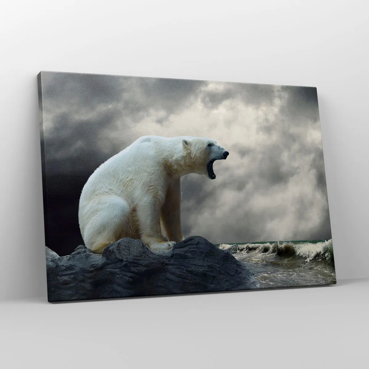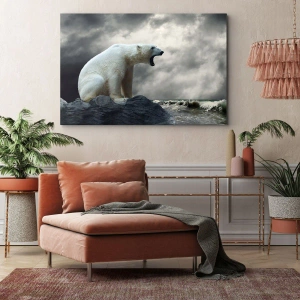 - A festmény egy jegesmedvét ábrázol, amint a viharos tenger felett sziklákon ül. A jelenet drámaisága és zordsága egyedi hangulatot teremt.