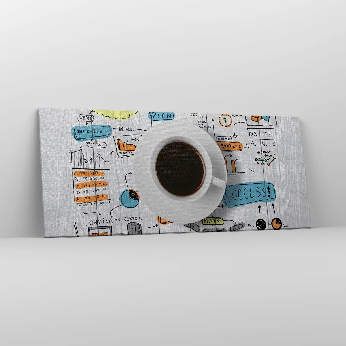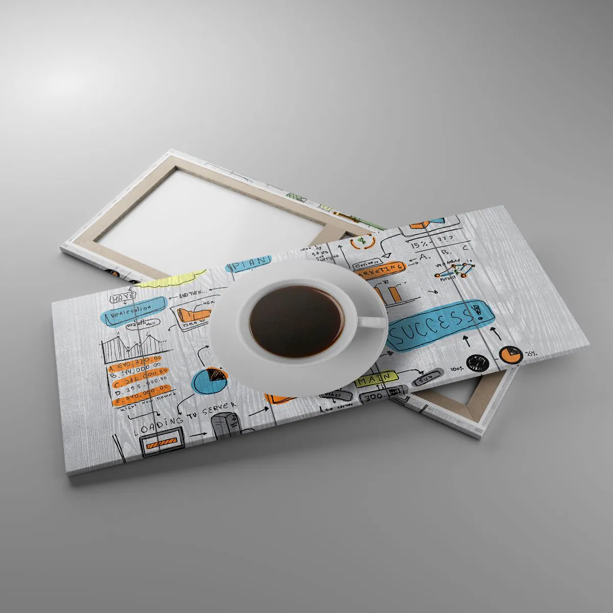 A vászon a keretre van feszítve. Az oldalak és a szélek nyomtatva vannak, a kép folytatását alkotva. A kép készen áll a falra akasztásra. Minden termékhez tartozik egy, a kerethez rögzített akasztó és egy rögzítőkészlet (csavar + dübel).