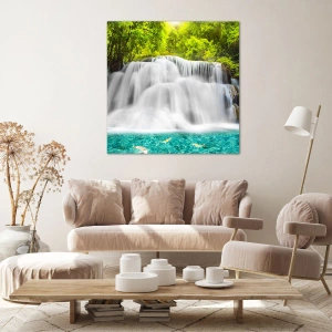 Vászonkép - Egy vízesés egy trópusi erdőben türkizkék vízzel - 70x50cm - Habzó zuhatag zöldtől azúrig - Modern fali dekoráció nappalihoz és hálószobához ARTTOR