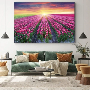 Ez a 70x50 cm-es tájképes vászonkép, melynek címe "Szépségfarm", egy tulipánmező lenyűgöző látványát ábrázolja naplementekor. A rózsaszín tulipánok dominálnak itt, egészen a horizontig nyúlva, lenyűgöző tájképet alkotva.
