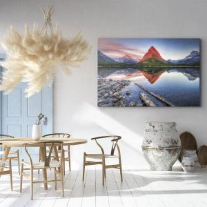 - A festmény egy fenséges hegyet ábrázol, amely naplementekor egy nyugodt tóban tükröződik. A természet harmóniáját és szépségét hozza el a belső térbe.