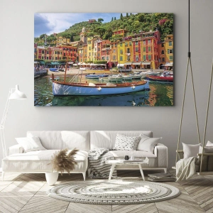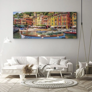 - Ez a festmény színes sorházakat és hajókat ábrázol egy olasz tengerparti városban. Tökéletes mediterrán stílusú belső terekhez és nyári hangulathoz.