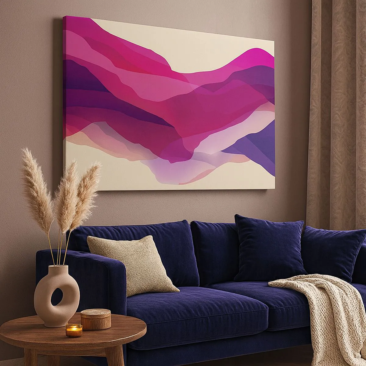 - Ez a festmény lila és rózsaszín árnyalatú absztrakt hullámokat ábrázol világos háttér előtt. Tökéletes dekoráció egy modern belső térbe.