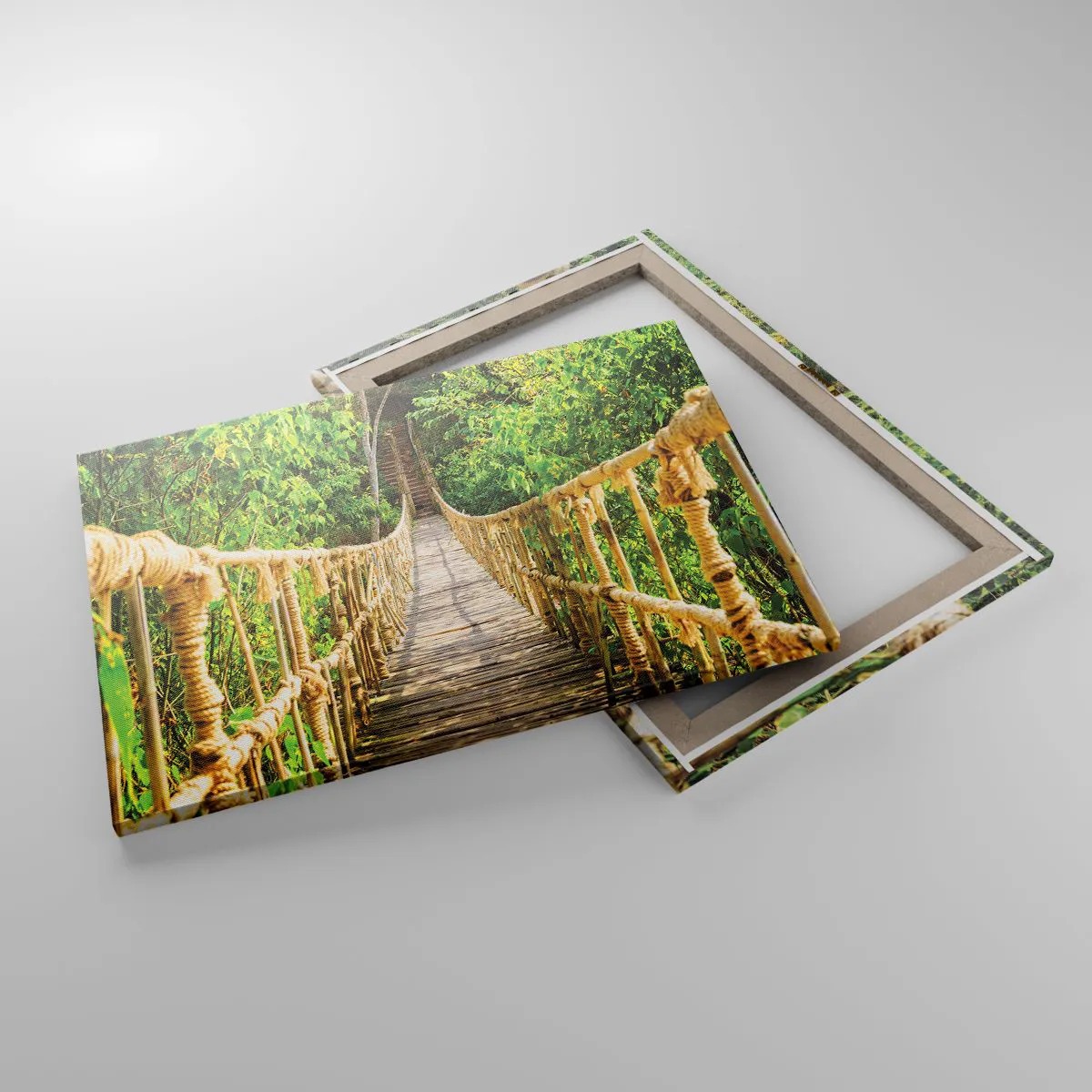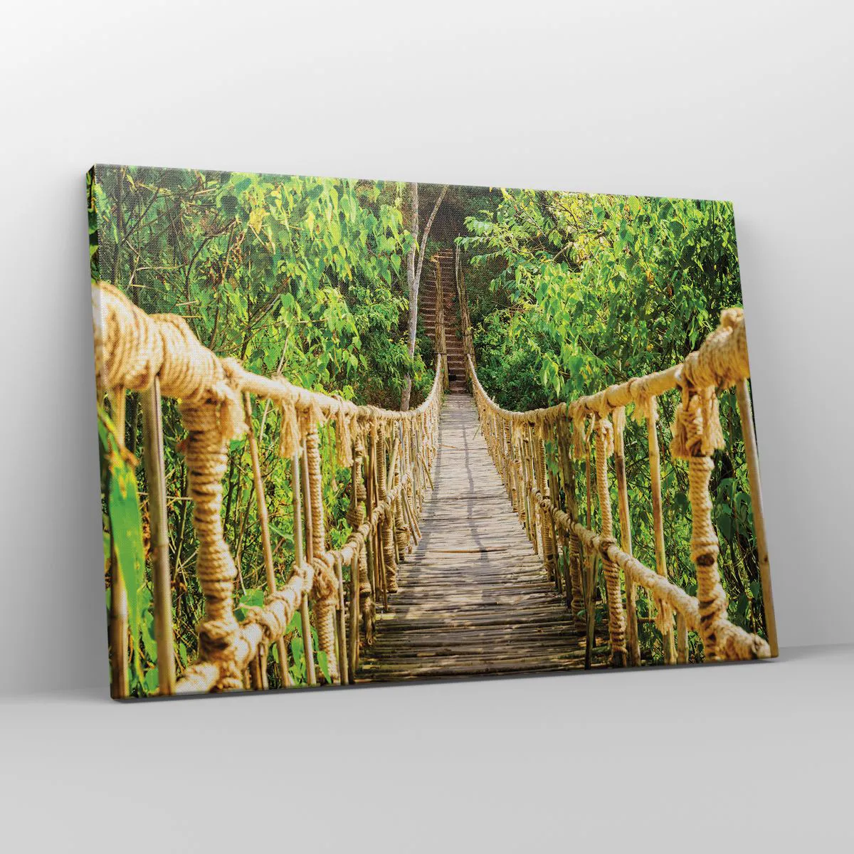 Egy intenzíven zöld növényzettel teli trópusi erdő ad hátteret a hídnak, amely mintha az ismeretlen felfedezésére hívna. A buja természet, a híd kötelei és a fa pallói hitelességet és kalandos jelleget kölcsönöznek a jelenetnek. Ez egy olyan festmény, amely vonzza a figyelmet és utazásra inspirál.