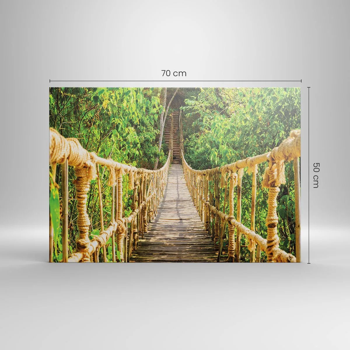 - Ez a vászonkép egy trópusi erdőben fekvő függőhidat ábrázol, buja növényzettel körülvéve. Tökéletes kiegészítője a természet és az egzotikum ihlette enteriőröknek, harmóniát és nyugalmat teremtve.