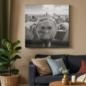 - Egy monokróm vászonkép, amely egy távcsövet ábrázol, a háttérben egy város látképével. Stílusos kiegészítője modern belső tereknek és inspiráló tereknek.