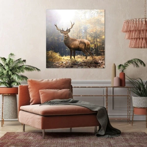 - Ez a festmény egy fenséges szarvast ábrázol, amint az őszi napsütésben áll, erdő ölelésében. Tökéletes dekoráció a természet és a harmonikus tájak szerelmeseinek.
