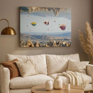 - Ez a festmény színes léggömböket ábrázol, amelyek egy festői, sziklás táj felett lebegnek. Tökéletes választás olyan enteriőrökbe, amelyek nyugalmat és inspirációt igénylő légkört igényelnek.