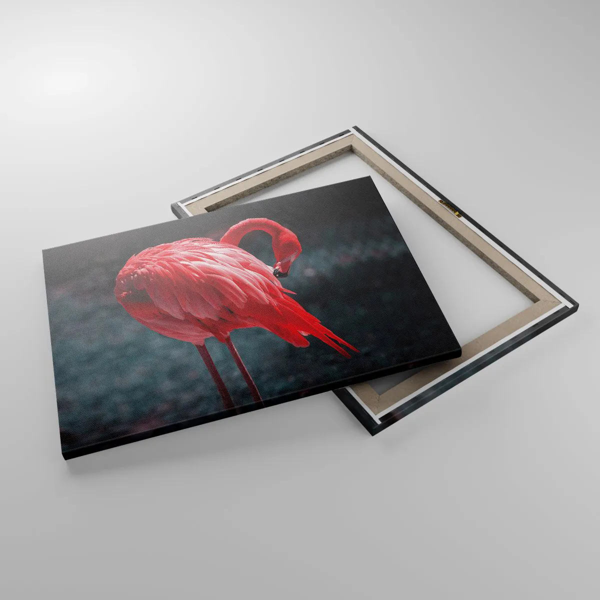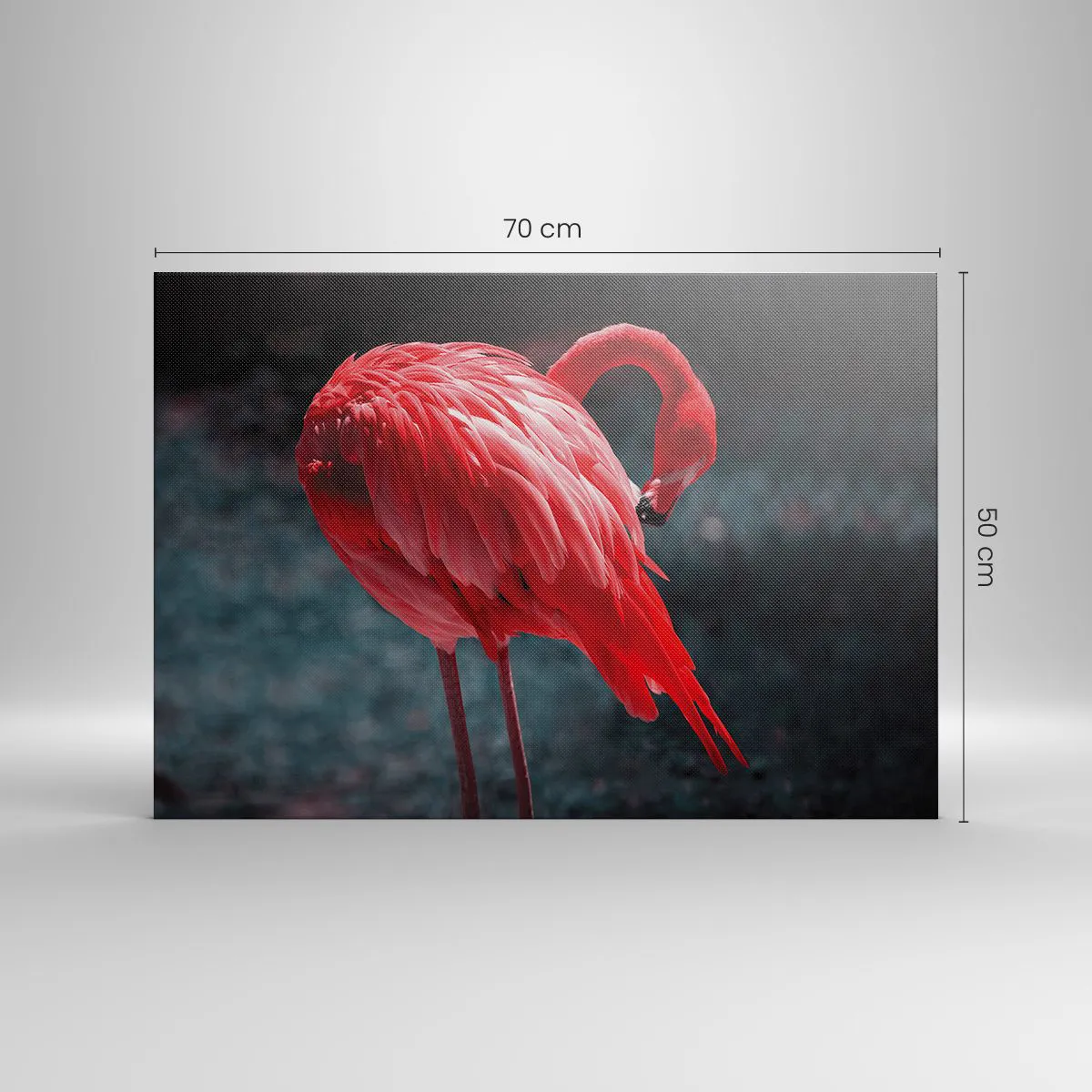 A művet kiváló minőségű, 70x50 cm-es, vízszintes formátumú vászonra készítették. A neves ARTTOR gyártó biztosította az anyagok tartósságát és a pontos színvisszaadást, ami garantálja, hogy a festmény hosszú éveken át gyönyörködteti a szemet. Minden részletet gondosan finomítottak, hogy megragadják a flamingó természetes szépségét és egyediségét.