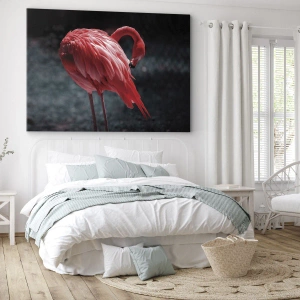 Vászonkép - Rózsaszín flamingó sötétzöld háttér előtt - 70x50cm - A természet karmazsinvörös verse - Modern fali dekoráció nappalihoz és hálószobához ARTTOR