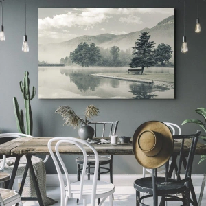 A festmény környezete a víz, a föld és az ég bájos harmóniáját mutatja be. A fák tükröződése a tóban és a víz felett lebegő finom köd mélységet és misztikumot kölcsönöz. A fókuszpont, a parton álló pad, hangsúlyozza az intimitást, és a természet által körülvett pihenésre csábít. A festmény minden részletét gondosan reprodukálták, kiemelve a mű művészi jellegét.