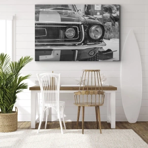 - festmény egy klasszikus autó motorháztetejének fekete-fehér felvételét ábrázolja, kiemelve a fényszóró részleteit és a jellegzetes dizájnt. Tökéletes kiegészítője az autórajongók és a retró rajongók belső tereinek.