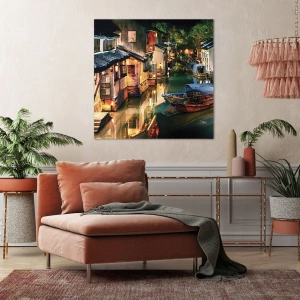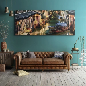 - Ez a 70x50 cm-es vászonkép a csatornák éjszakai látképét ábrázolja, melyeket hagyományos hajók és házak szegélyeznek. Tökéletes az egzotikum és az egyedi hangulat szerelmeseinek.