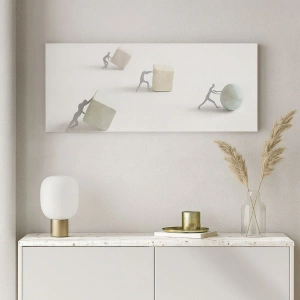 - Ez a festmény miniatűr alakokat ábrázol, akik geometrikus formákat tolnak egymáshoz világos háttér előtt. A kemény munka és az elszántság kifejező szimbolikája ideális a modern belső terekbe.