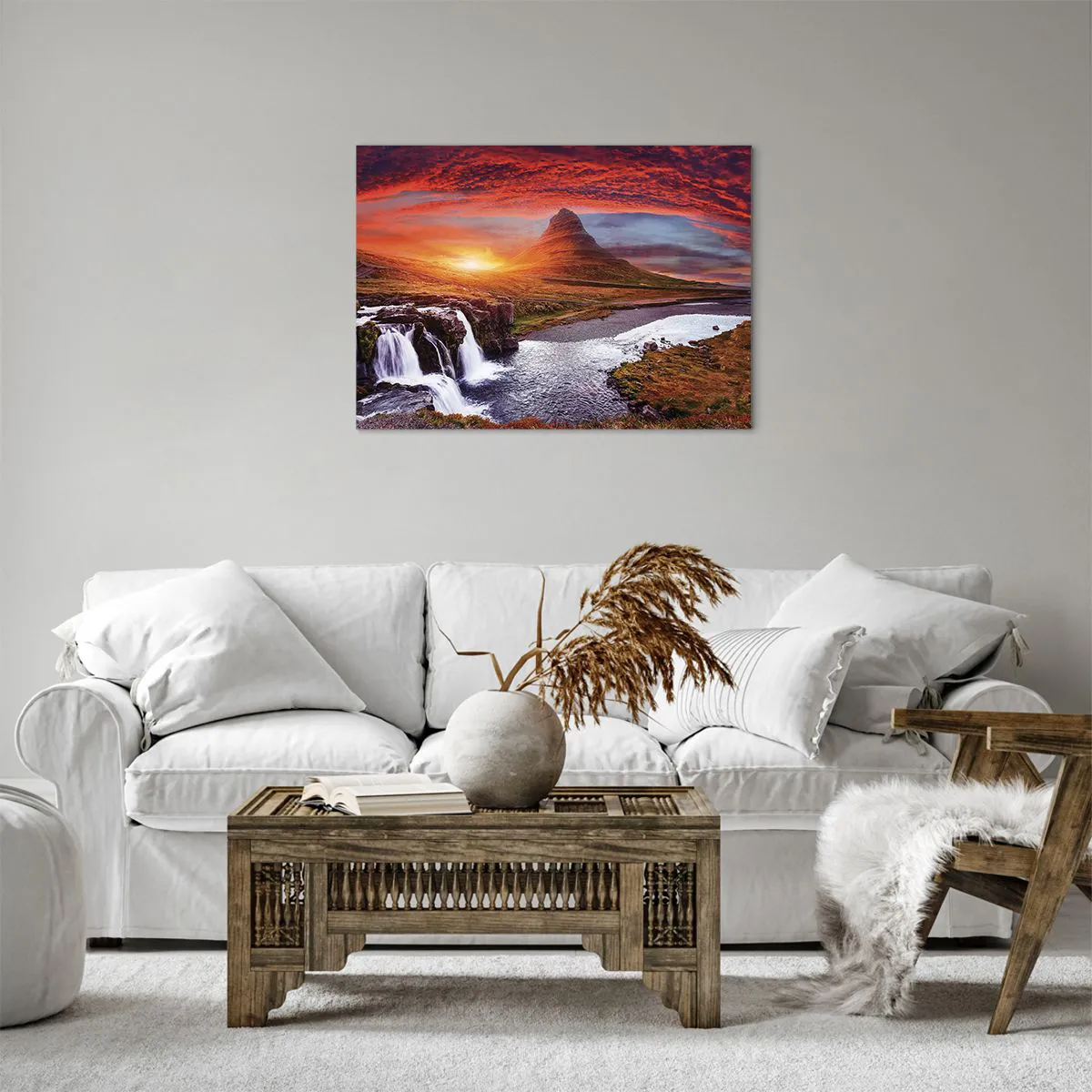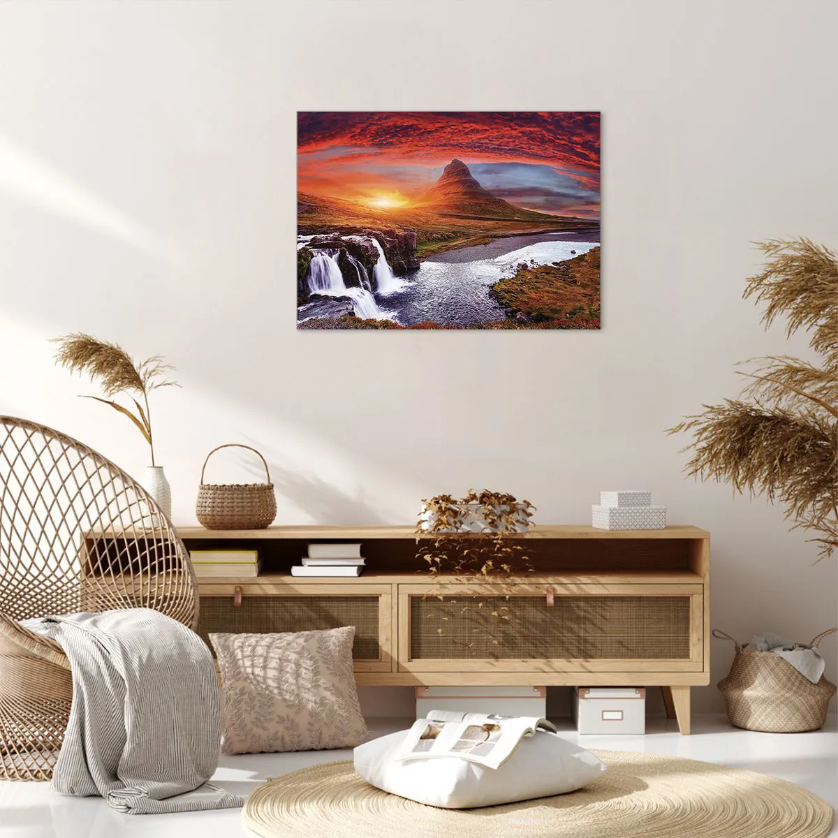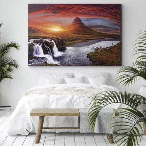 • Ez a festmény egy fenséges hegyi tájat ábrázol egy vízeséssel a naplemente meleg fényében. Az élénk színek és a táj természetes szépsége tökéletes dekorációvá teszi bármilyen belső térbe.