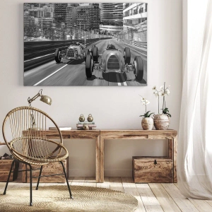 Vászonkép - Fekete-fehér retro autóverseny jelenet - 70x50cm - Réges-régen Monte Carlóban - Modern fali dekoráció nappalihoz és hálószobához ARTTOR