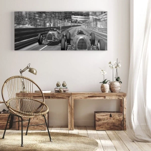 A festmény a régi idők versenyeinek hangulatát ragadja meg, ahol a sebesség, a pontosság és a stílus számított. A monokróm árnyalatok időtlen karaktert adnak az egésznek, kiemelve a kompozíció részleteit és harmóniáját. Ezáltal a festmény ideális választás az autózás és a történelem ihlette művészet szerelmeseinek.